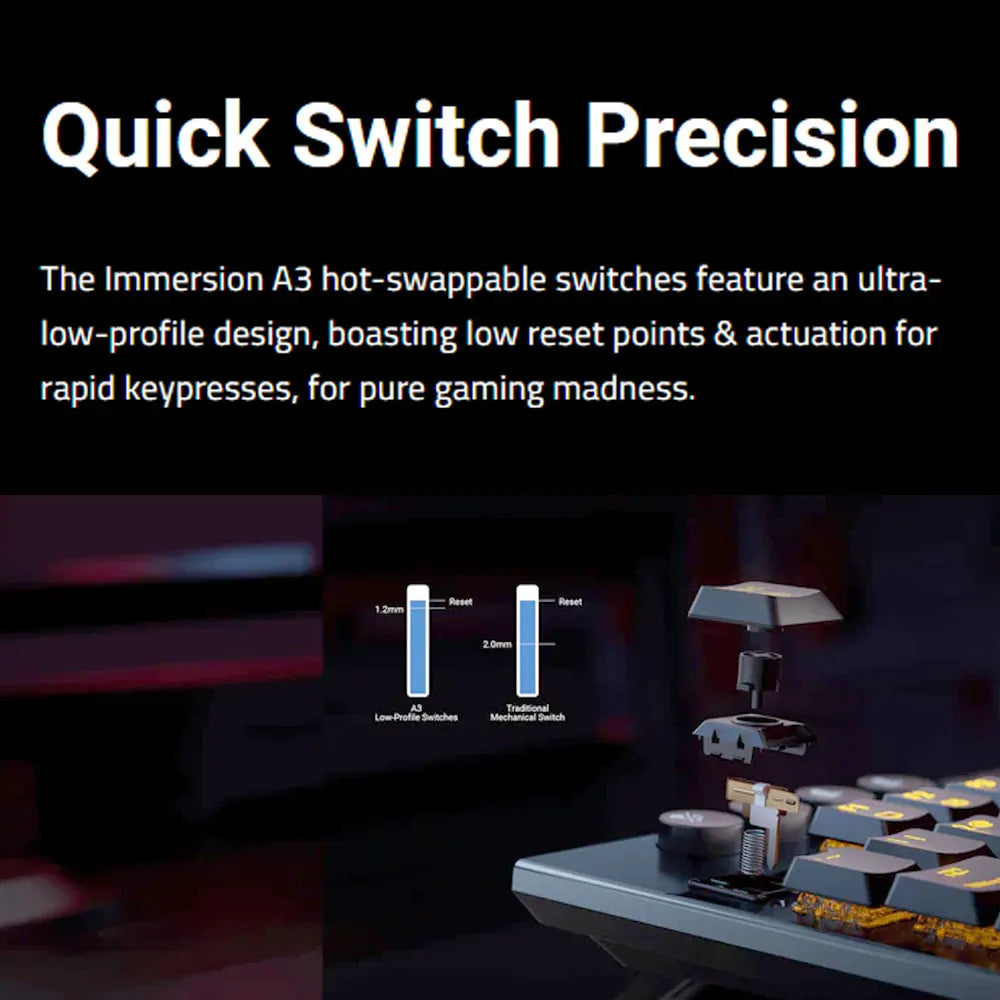 【Durable Low Profile keyboard】The Immersion A3 Features Kailh low-profile switches with a 50 million keypress lifespan, a durable aluminum frame, and a sleek 27.70mm thickness. This gaming keyboard combines performance, durability, and style for ultimate gameplay.