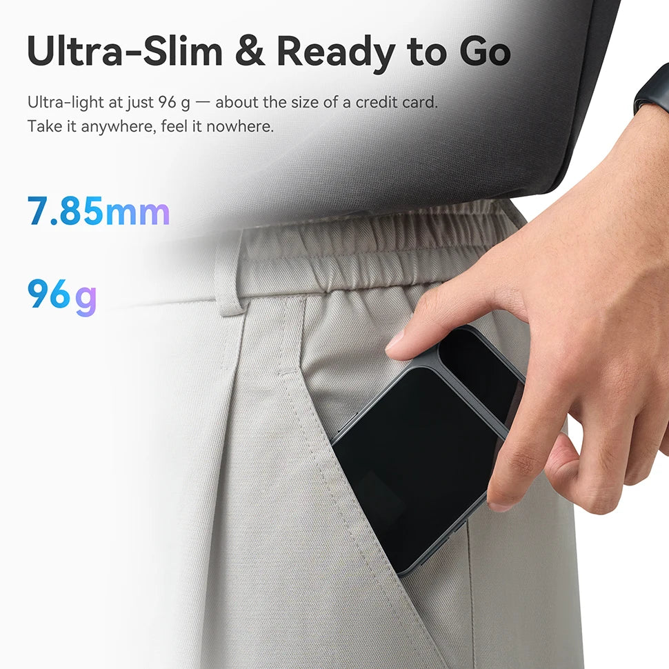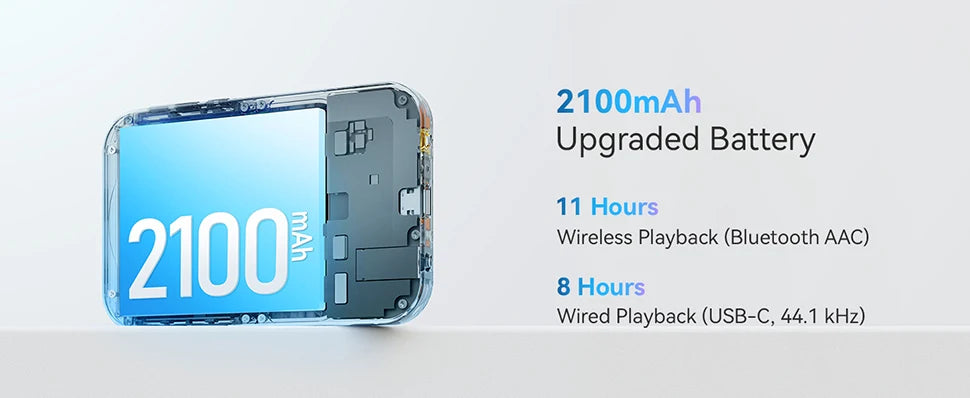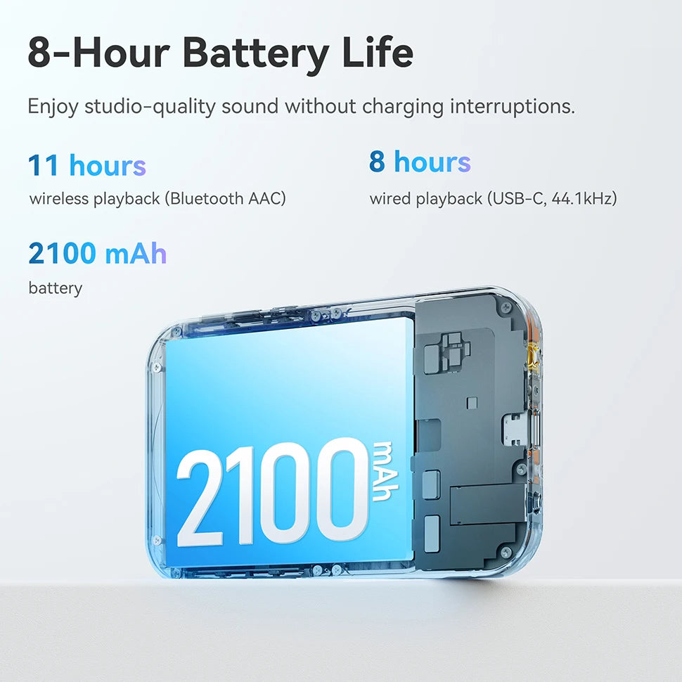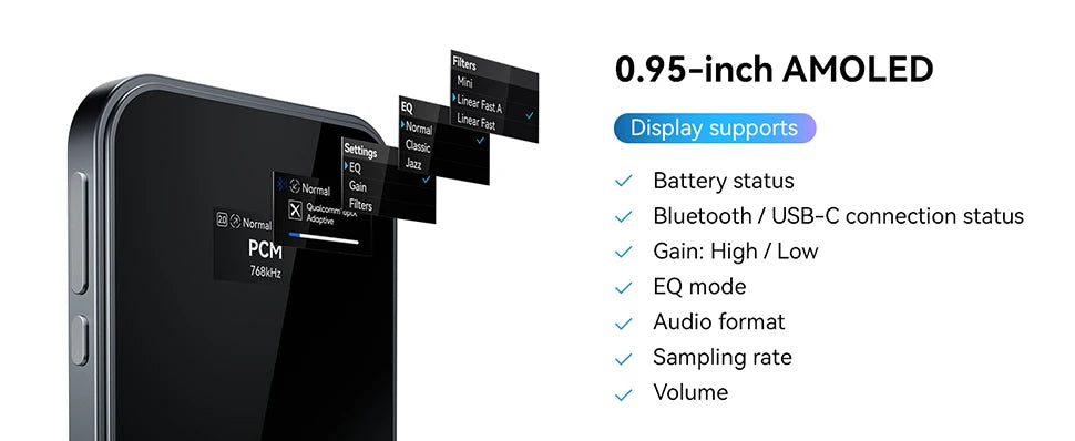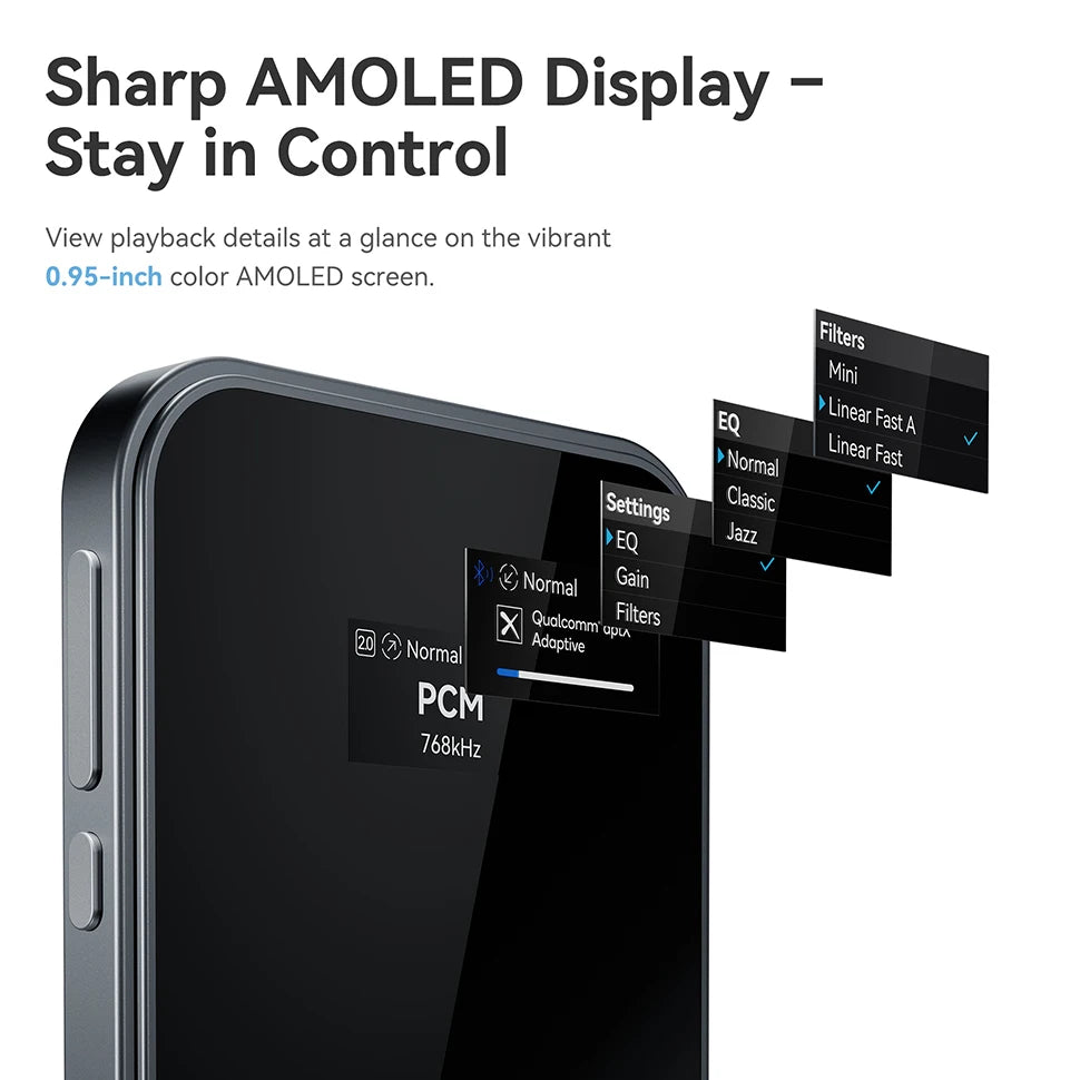Ultra-Slim & Pocket-Friendly with AMOLED Display – Weighing only 96g and just 7.85mm thin, Tea Pro is about the size of a credit card, making it easy to carry anywhere. Its bright 0.95-inch AMOLED screen shows your playback info at a glance, keeping you in control on the go.