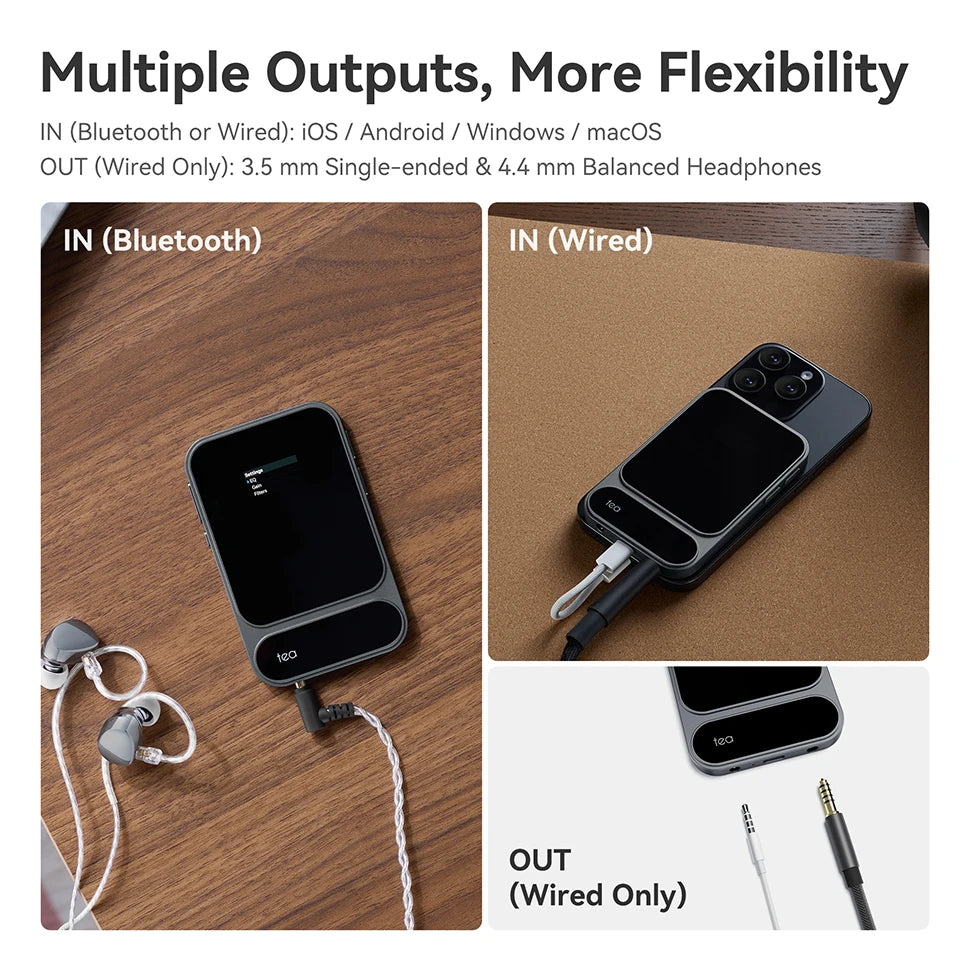 Studio-Quality Audio on the Go – Supports Bluetooth or wired input, with wired-only outputs for 3.5mm single-ended and 4.4mm balanced headphones. Compatible with iOS, Android, Windows, and macOS. Advanced Bluetooth codecs (SBC, AAC, LDAC, aptX, aptX HD, aptX Adaptive) deliver crisp, detailed, near-lossless wireless audio. Enjoy up to 768kHz/32-bit PCM and native DSD512 with 32 precision resistors for true high-fidelity sound.