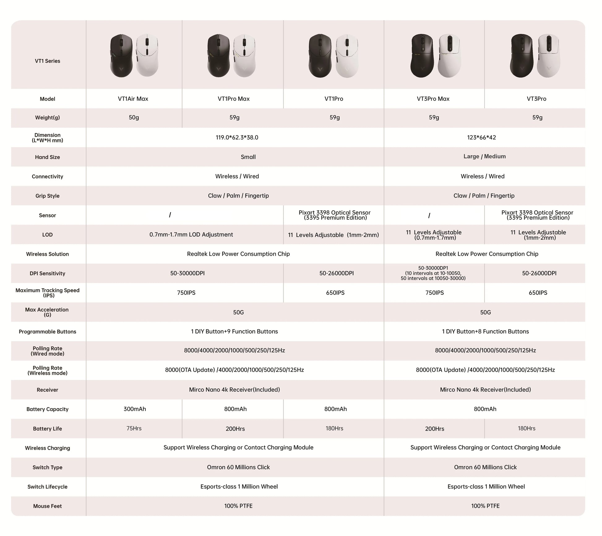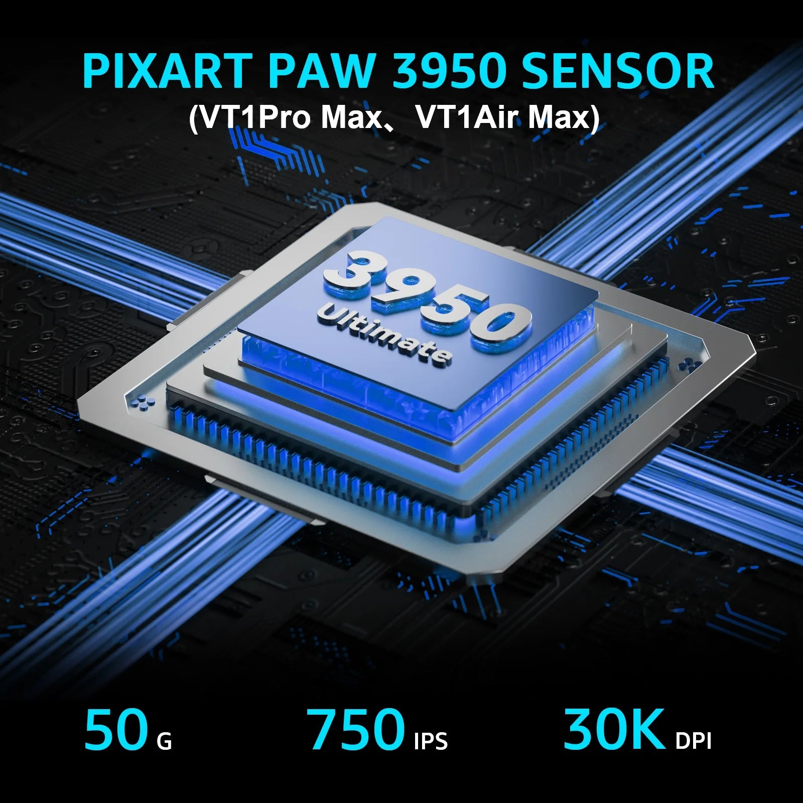 Unrivaled Esports-Grade Sensor: Featuring PAW3398(VT1PRO)/PAW3950(VT1PRO Max/VT1Air Max) Ultimate optical sensor, the VT1PRO/VT1PRO Max/VT1Air Max brings accuracy, speed and performance to next level --- which delivers sub-micron precision with 26K DPI (50 intervals) and 650 IPS/ 30K DPI (10 intervals) and 750 IPS.