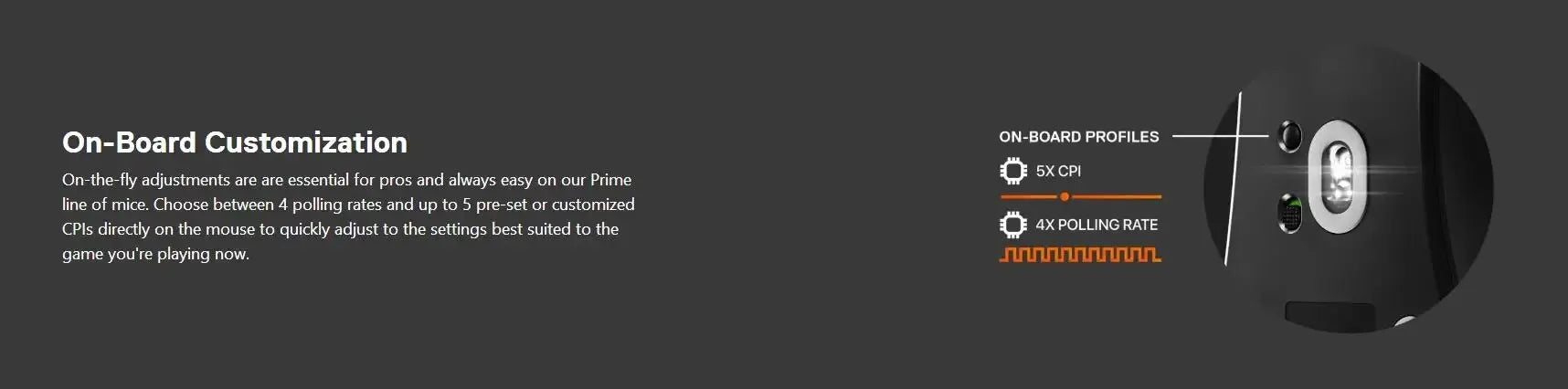 On-the-fly adjustments are are essential for pros and always easy on our Prime line of mice. Choose between 4 polling rates and up to 5 pre-set or customized CPIs directly on the mouse to quickly adjust to the settings best suited to the game you're playing now.