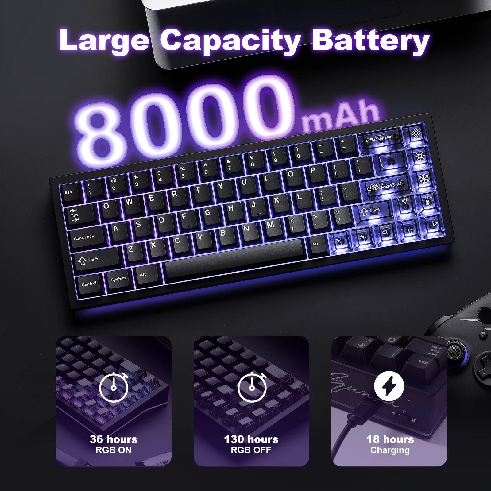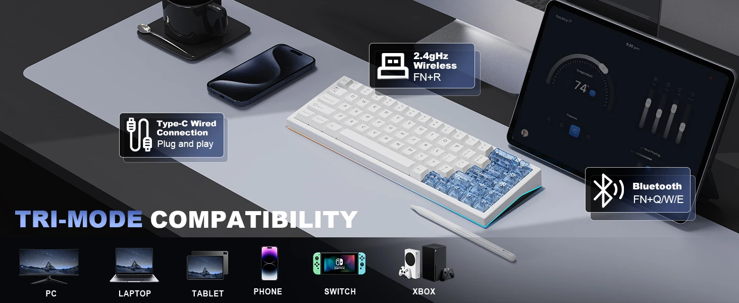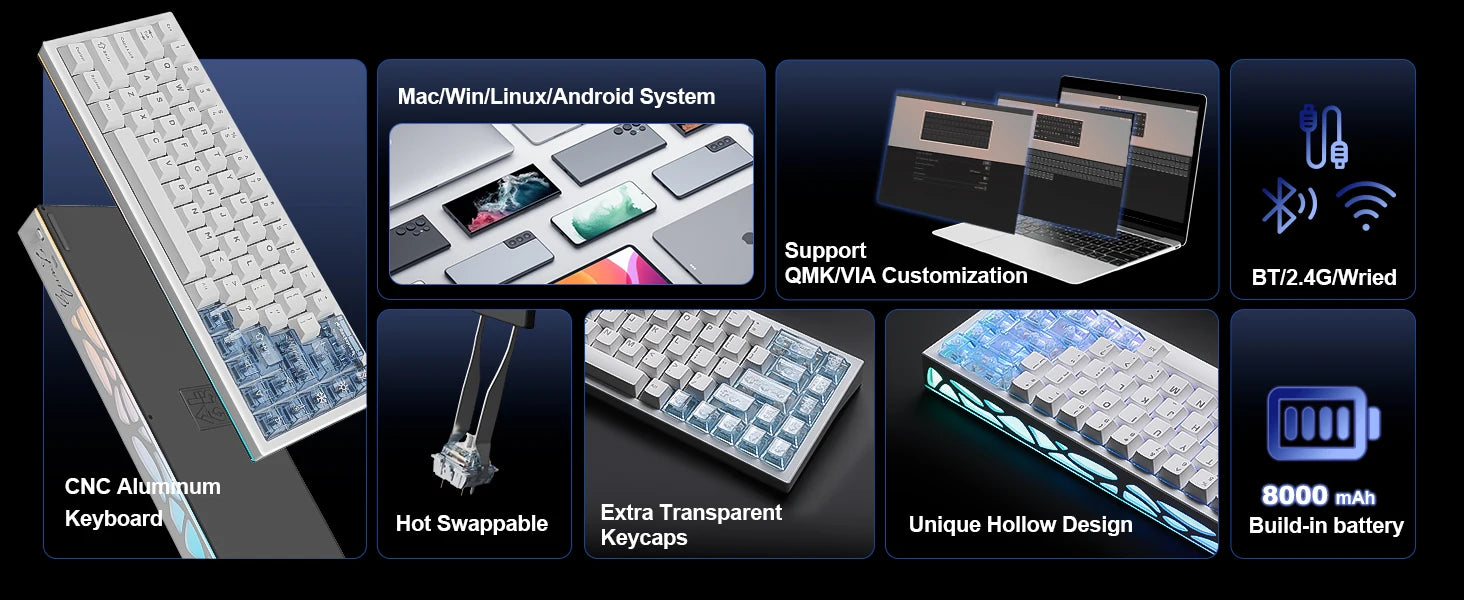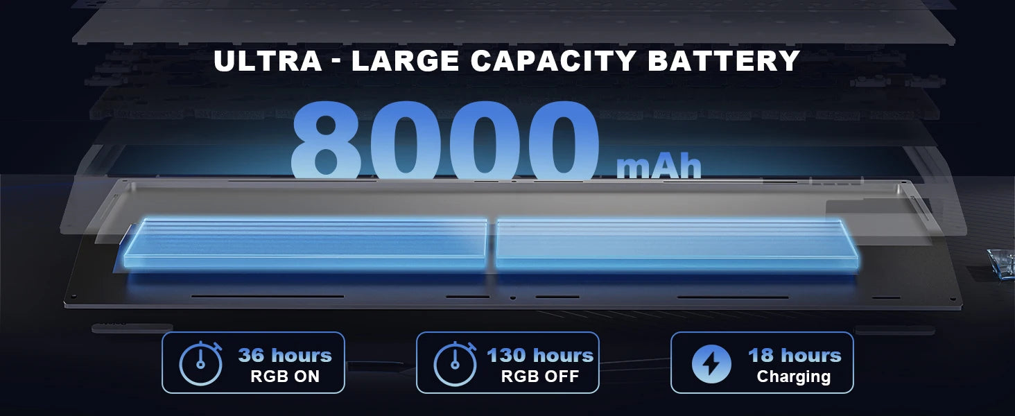 The wireless keyboard has tri-mode connectivity, allowing you to easily switch between Bluetooth, 2.4GHz wireless, and USB-C wired modes. The Win / Mac keyboard can connect up to 5 devices, such as a tablet, PC, phone, or laptop, simultaneously and enjoy uninterrupted usage thanks to the high-capacity 8000mAh battery and 1000hz polling rate, designed to keep you focused on gaming, work, or programming without frequent recharging.