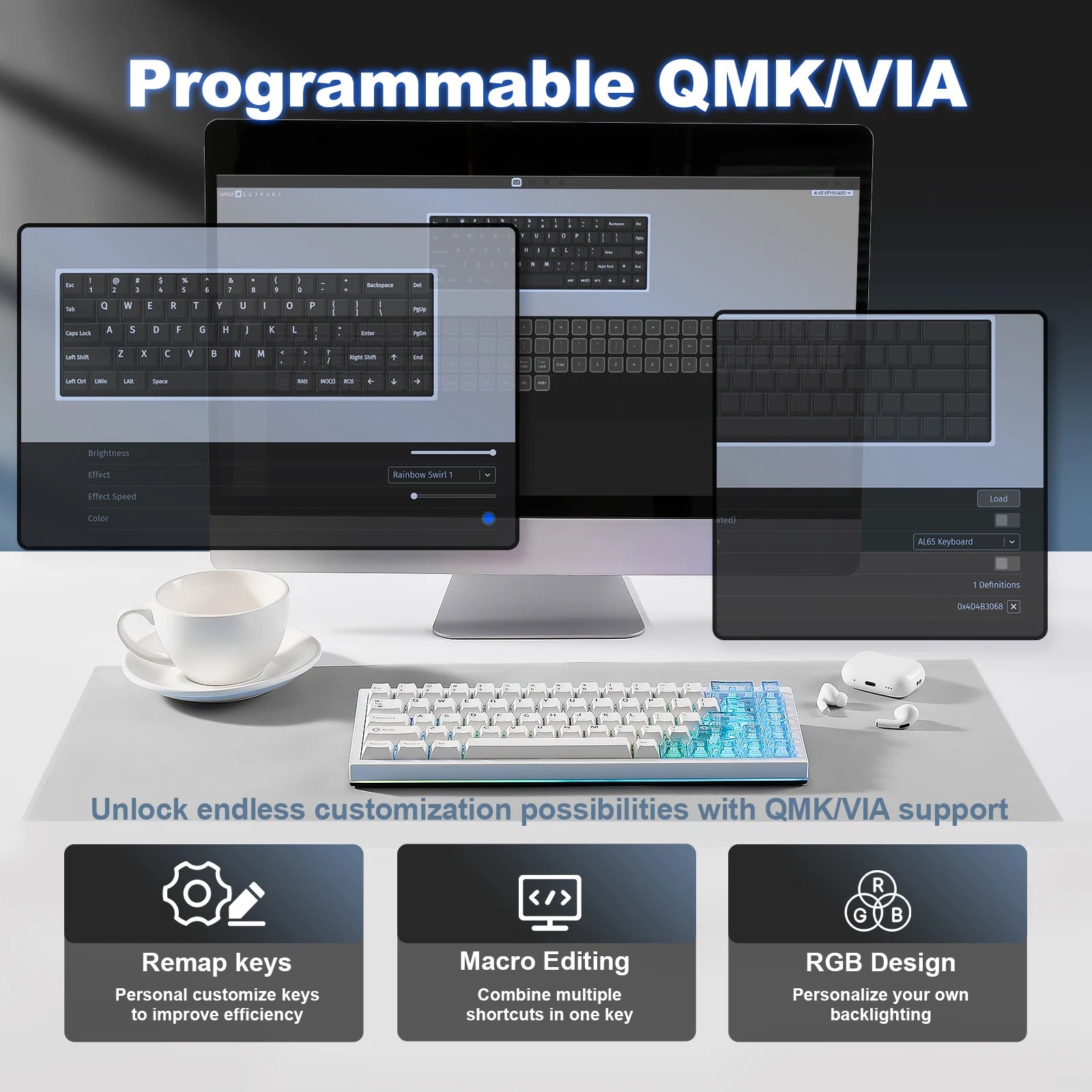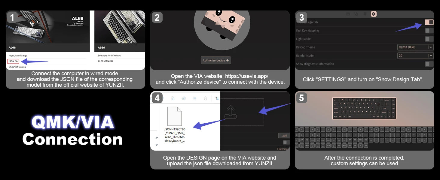 YUNZII AL65 gaming keyboard supports QMK/VIA software, enabling seamless key remapping, macro, and RGB customization. Compatible with Windows and macOS, this custom aluminum mechanical keyboard takes an open-source customization platform, providing unparalleled flexibility, and empowering users to create a personalized typing and gaming experience.
